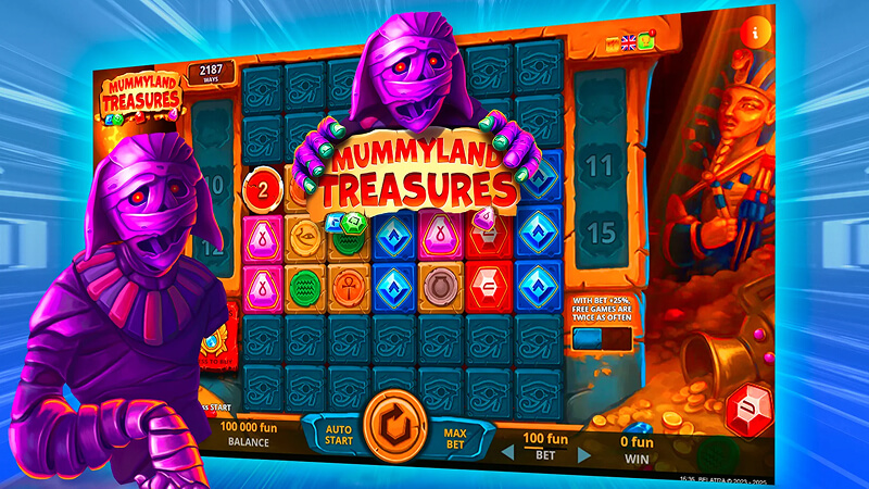 Belatra Games больше тридцати лет создавали софт для наземных казино, но именно Mummyland Treasures стал той работой, которая доказала: компания способна не просто догонять лидеров рынка, а задавать собственный темп. Слот погружает в мир золотых саркофагов, тайных иероглифов и мумии, которая посмеивается над вашими крупными выигрышами. Главное, что отличает Mummyland Treasures от десятков других египетских слотов, — это масштаб механики. Сетка 7×7 с каскадами и расширяемым полем, 823 543 способа собрать комбинацию, фриспины с накопительным множителем и уникальная система Craft Bonus, позволяющая вручную собрать бонусную игру под свои предпочтения. Всё это упаковано в яркую, почти мультяшную графику с приятной порцией чёрного юмора.