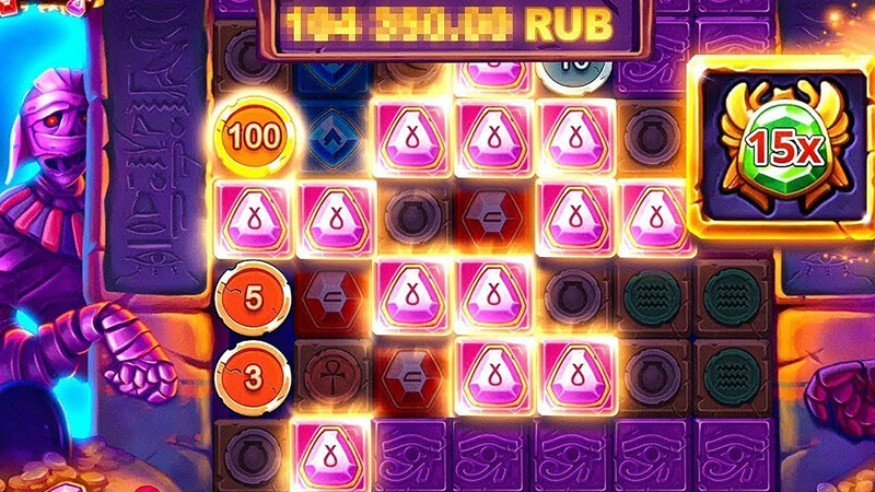 Во время бонусного раунда накопительный множитель не сбрасывается между вращениями, а продолжает расти. Случайные скарабеи и мумии добавляют к нему значения от ×1 до ×10. В конце каждого фриспина текущий выигрыш умножается на накопленный коэффициент. Именно эта механика создаёт потенциал для ×25 000.