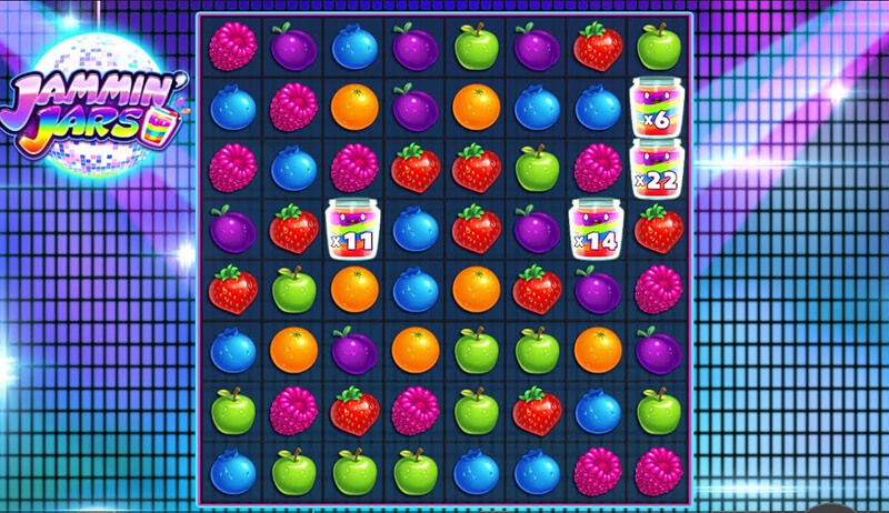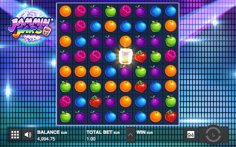 Jammin' Jars ломает привычную схему «барабаны плюс линии» и предлагает взамен чистый кластерный геймплей. Игровое поле — квадрат 8×8, на котором символы падают сверху. Если пять или более одинаковых фруктов оказываются рядом (по горизонтали или вертикали, но не по диагонали), кластер засчитывается как выигрыш и исчезает. На освободившиеся места сверху падают новые символы, и процесс повторяется.